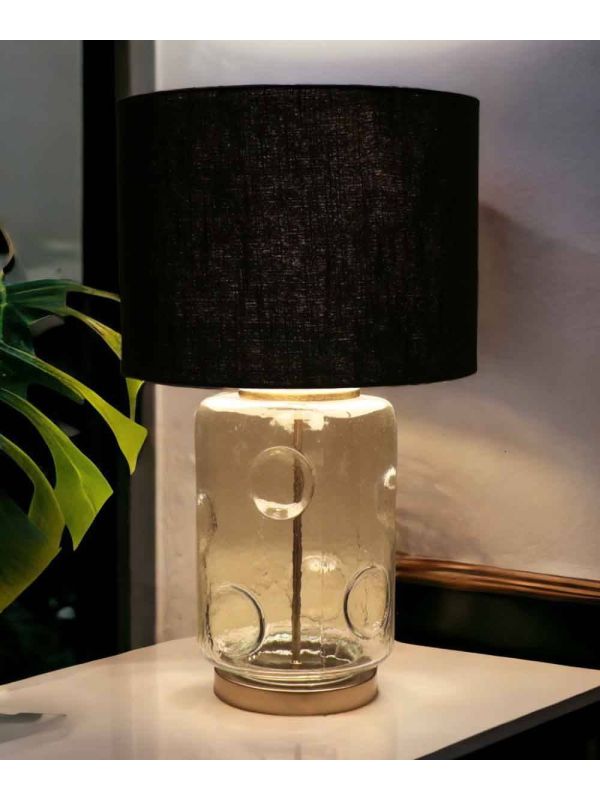 With an antique brass finished foot, pipe, and finial, the Glanz Glass Table Lamp features a glass base with debossed circles, and a luxury slub cotton black shade.