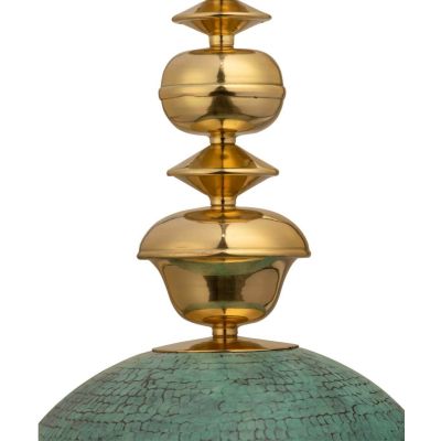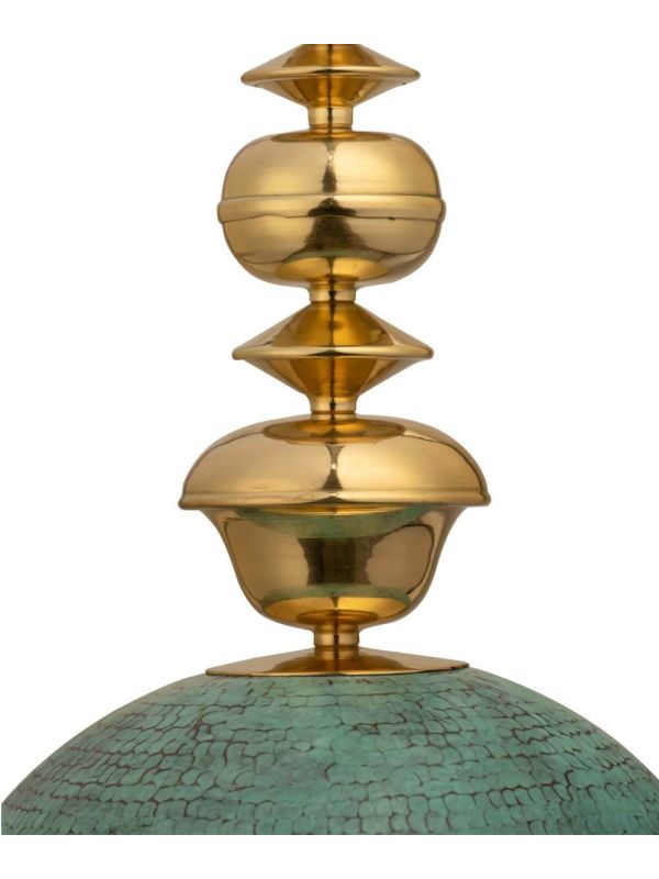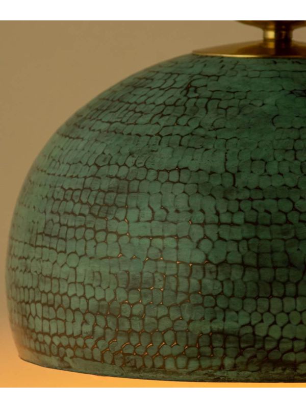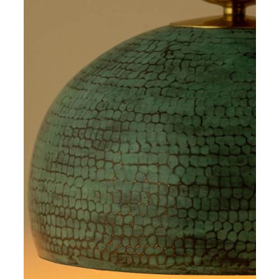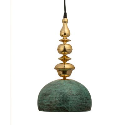 A beautiful hanging pendant light; handcrafted by skilled artisans and made with wood and brass and finished with a Verdi Gris look to give an antique look