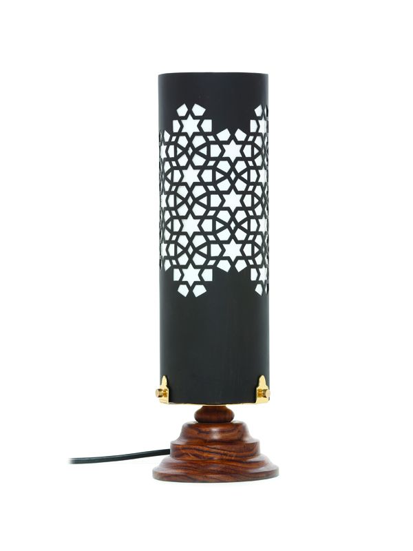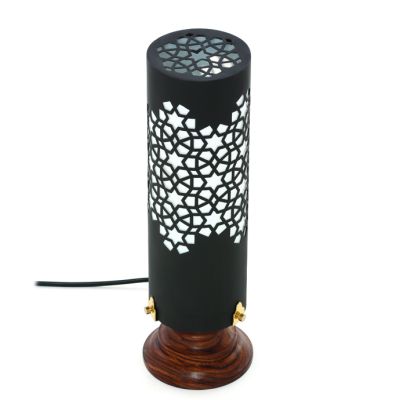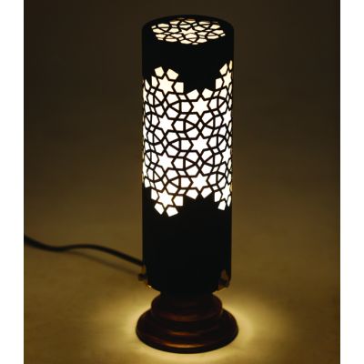 A black metal table lamp handcrafted by master artisans and inspired by Mughal architecture