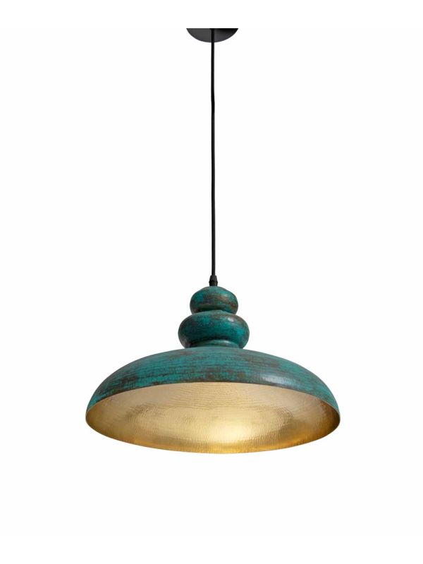 With its dual finish, the pendant light is a fresh design. The entire piece is made in brass with metal hammering all the surface. The outer is all patinated with an antique finish texture and the inner surface is clean polished hammered texture.