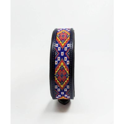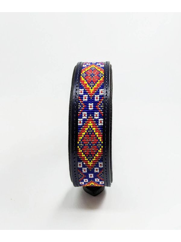 Colour: Dark blue leather and multi-color beadwork embroidery