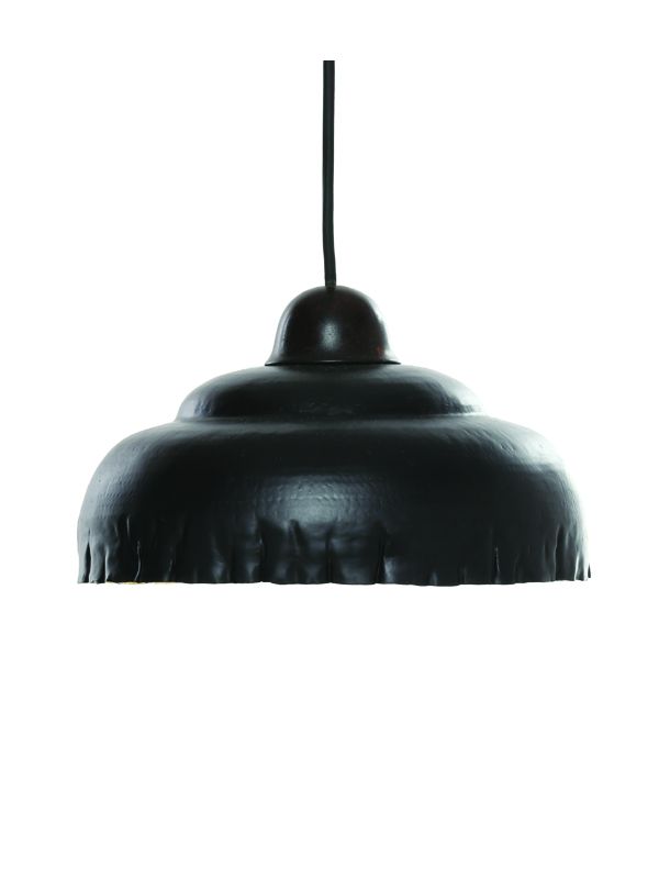 Made with a 20 gauge brass sheet, the wavy pendant lamp has an antique black exterior in contrast with a hand-beaten warm gold interior. The edges are left rough while shaping. Each piece is handmade and therefore has a unique personality.